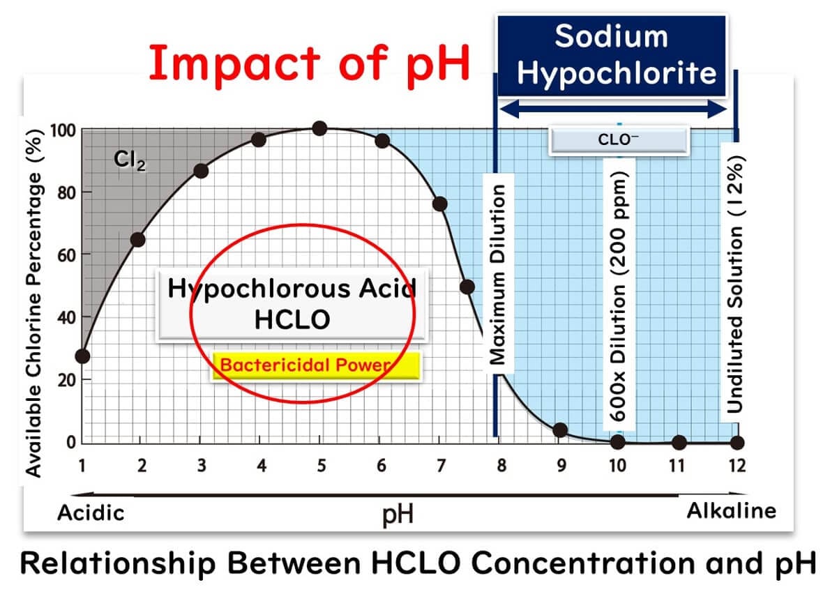 Acidic electrolyzed water, also known as hypochlorous acid water, is an advanced disinfectant that excels in overcoming one of the key limitations of sodium hypochlorite: its dependence on pH levels for effectiveness. Unlike sodium hypochlorite, hypochlorous acid operates in a lower pH range, where its composition is predominantly hypochlorous acid (HCLO). This makes it significantly more effective in microbial inactivation, as highlighted in our previous article on sodium hypochlorite.