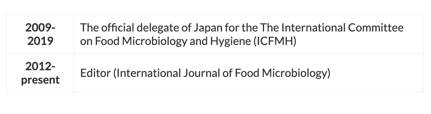He has extensive research and knowledge in food microbiology, including food safety, food and health, foodborne pathogens, food spoilage bacteria and enterobacteria, and has published over 200 international peer-reviewed papers. In recognition of his contributions to the field of food microbiology, he has received the Japanese Society for Food Hygiene Technical Contribution Award (2012) and the Japanese Society for Food Microbiology Award (2019). He has also served as a Japanese national reviewer for Grants-in-Aid for Scientific Research many times and has twice received the Exemplary Reviewer Award (JSPS) (2008, 2012). He served as President of the Japanese Society for Food Hygiene (2017-2019) and Vice-President of the Japanese Society for Food Microbiology (2020-2022). He is also a member of the scientific advisory bodies of the Ministry of Health, Labour and Welfare (2011-2020) and the Cabinet Office (2013-present).