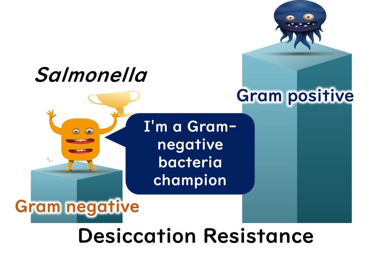 To illustrate this resistance further, an experiment compared Staphylococcus aureus (a Gram-positive bacterium) with Salmonella and Campylobacter, both Gram-negative. Campylobacter was the most sensitive to drying, while Salmonella showed significantly higher resistance than Campylobacter but still less than Staphylococcus aureus.