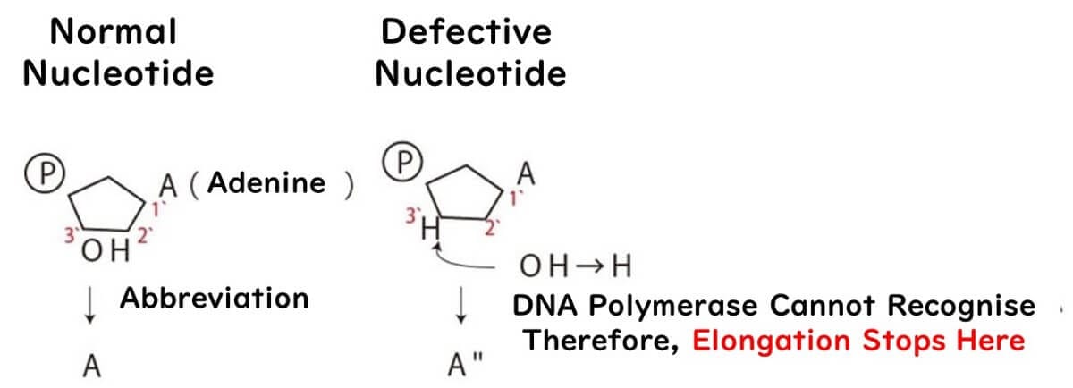 By introducing modified nucleotides (lacking a 3’ OH group), the DNA polymerase cannot extend the DNA further when it incorporates them.