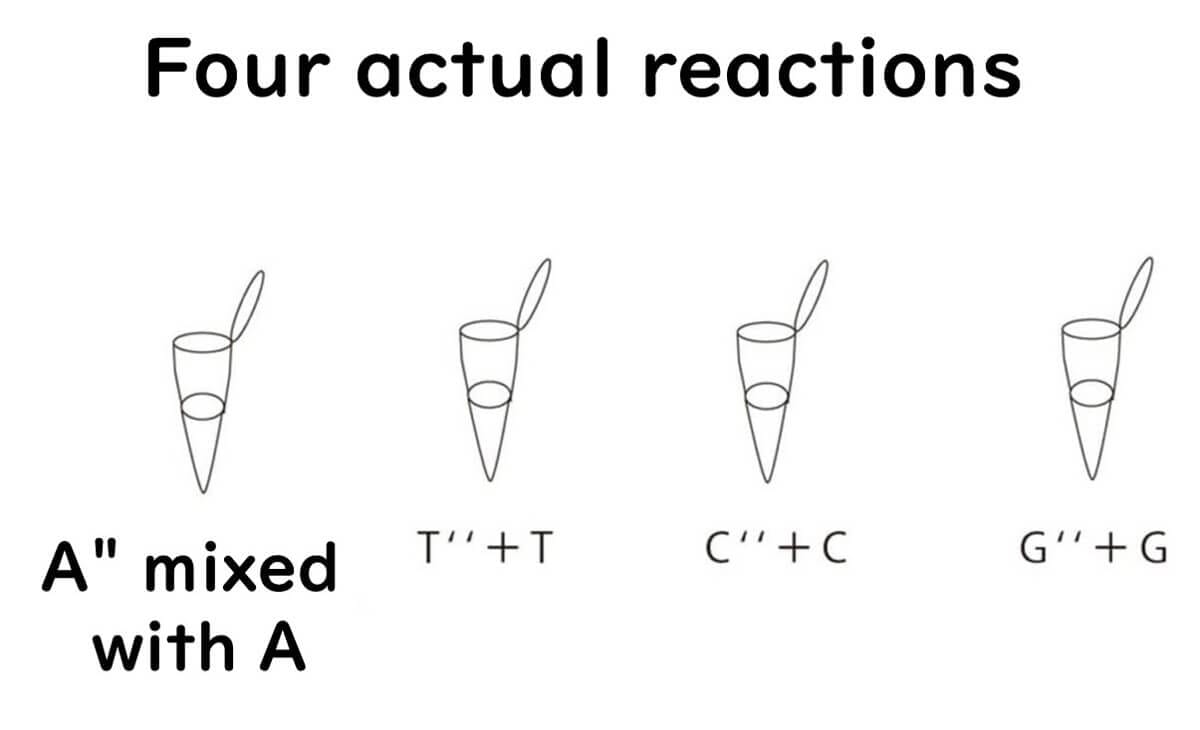 This process is repeated individually for each nucleotide (A, T, C, G) using four separate reaction mixtures.