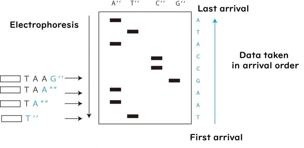 In early DNA sequencing, electrophoresis was stopped at intervals to analyze DNA fragments one step at a time. However, in the early 1990s, a new method emerged that used fluorescently labeled nucleotides (A, T, C, G). Each nucleotide was tagged with a unique fluorescent dye, allowing continuous electrophoresis without needing to pause the process.