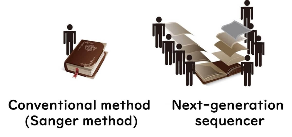 In contrast, NGS works like giving each page to thousands of readers, allowing the book to be fully read in a single day.