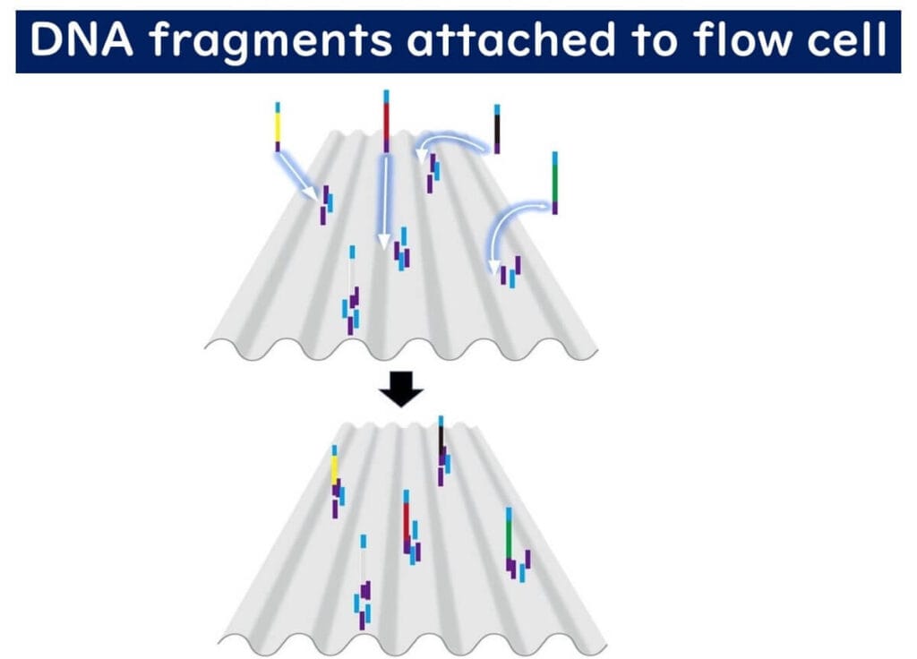 Once bound to the flow cell, the DNA undergoes a unique amplification process called bridge PCR: