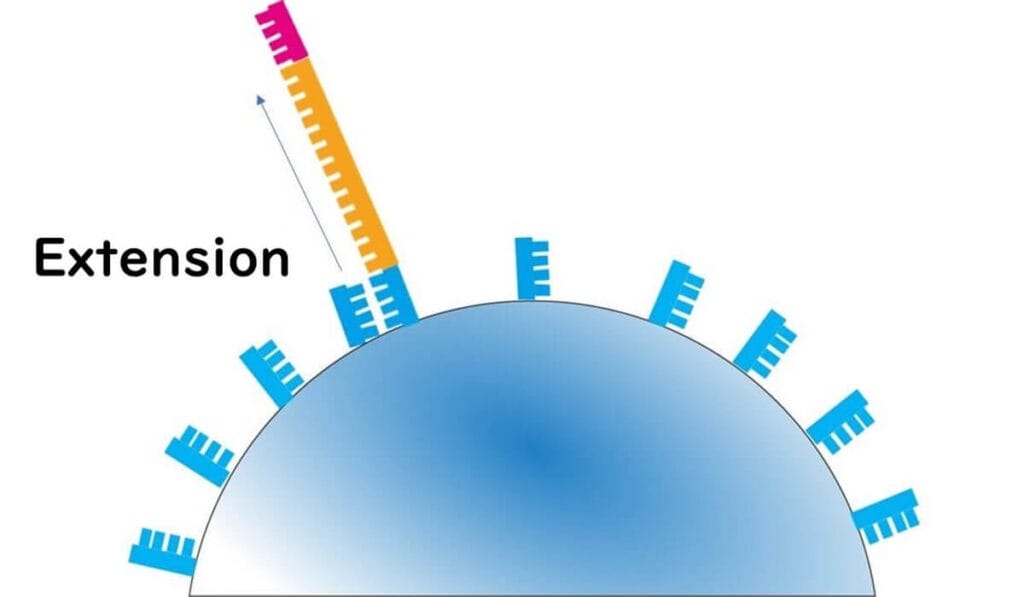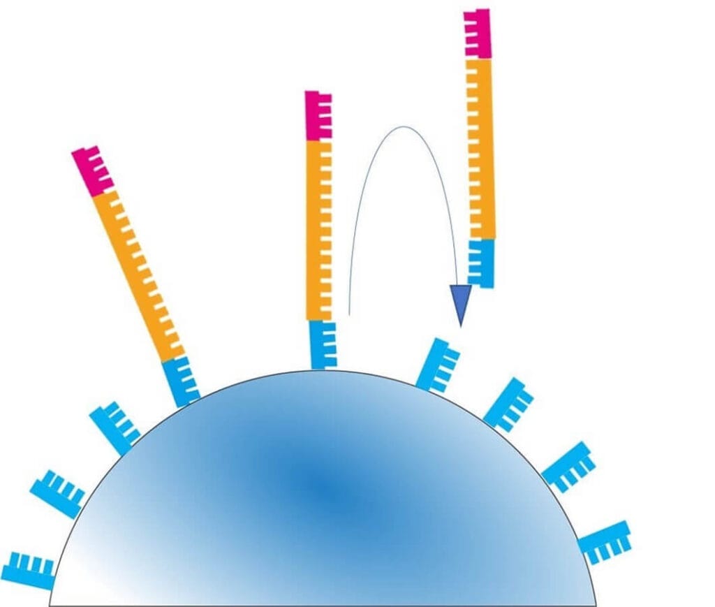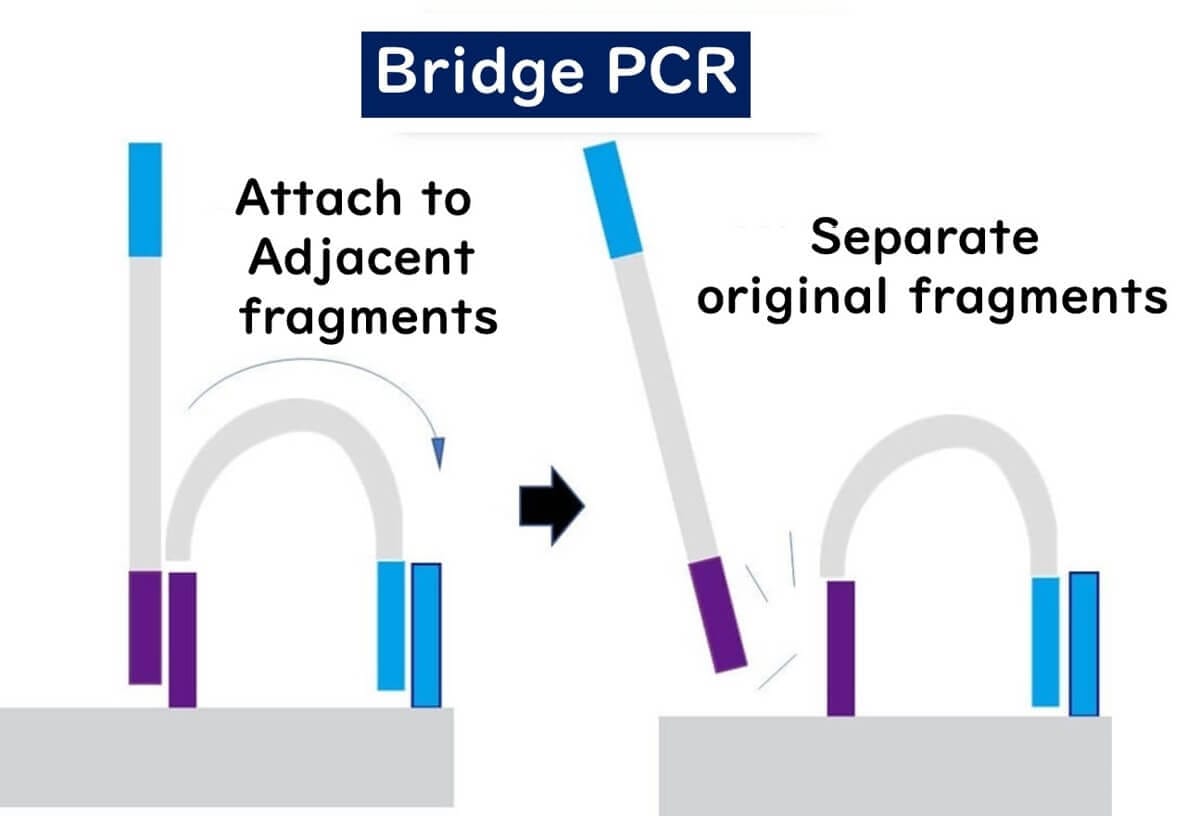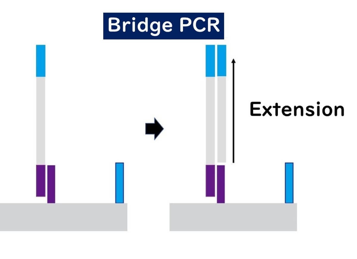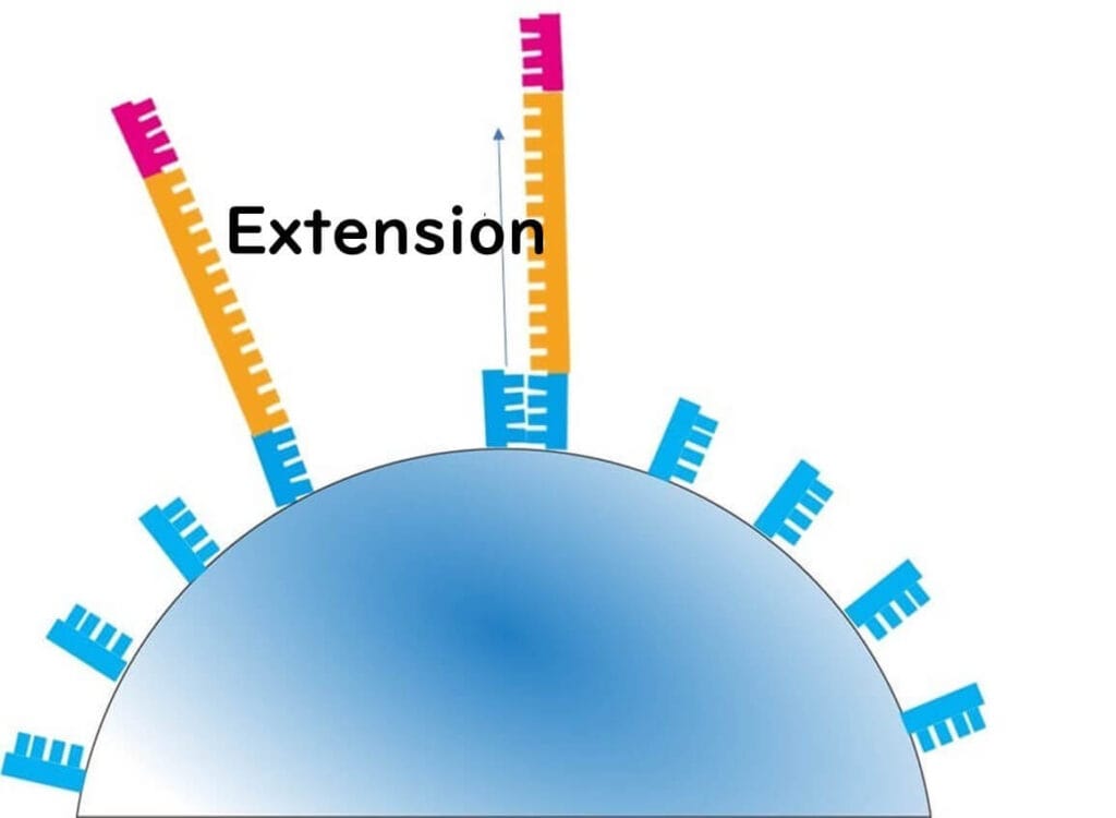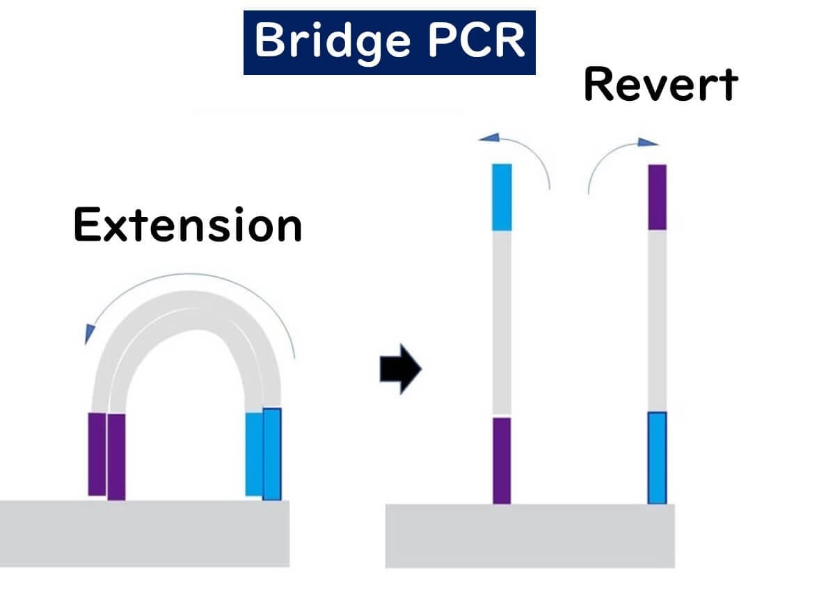Bridge formation – The ends of the newly synthesized DNA fragments bind to nearby adapter sequences, creating bridge-like structures.