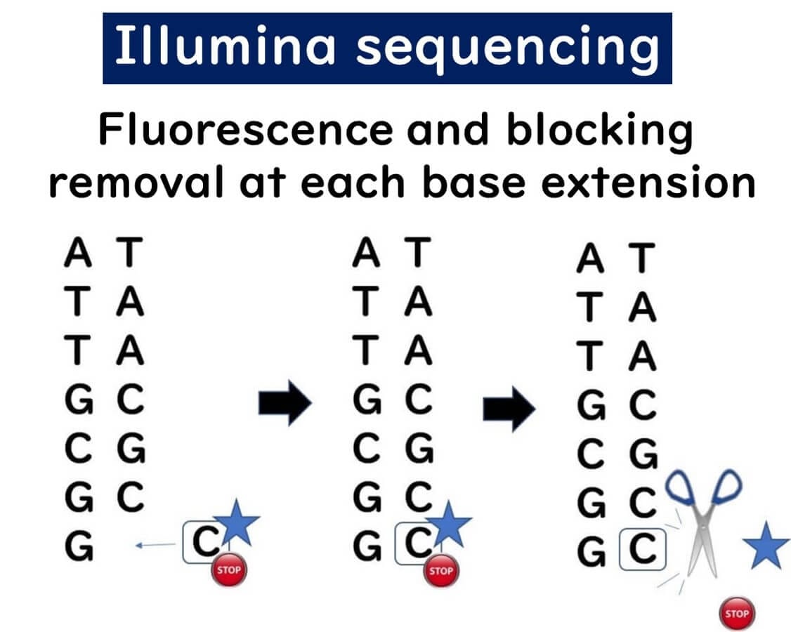 Stepwise Base Addition – The sequencer adds one nucleotide at a time, detects fluorescence, then removes the fluorescent tag and blocking group before adding the next base.