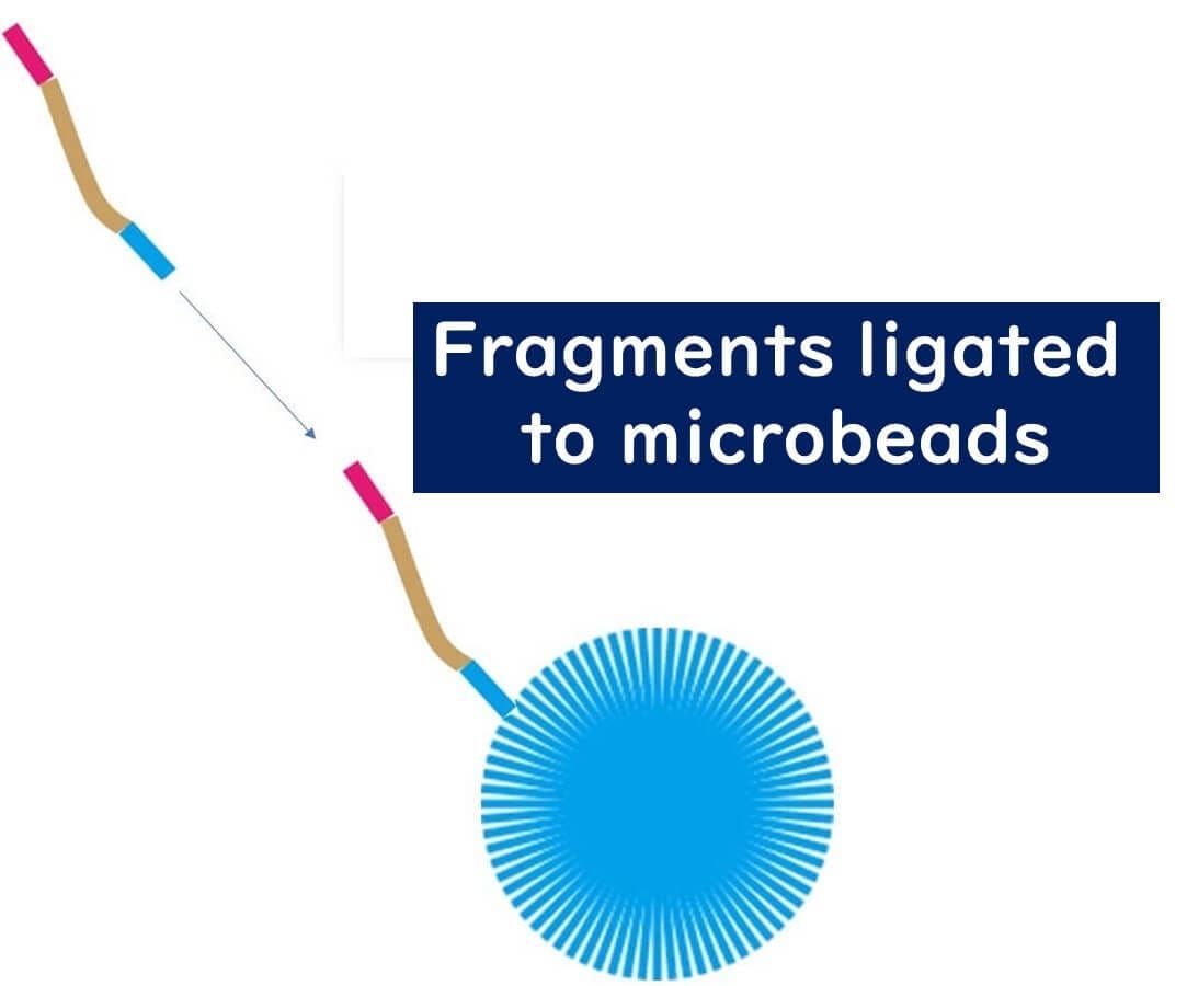 The fragmented DNA is bound to microbeads coated with complementary adapter sequences.