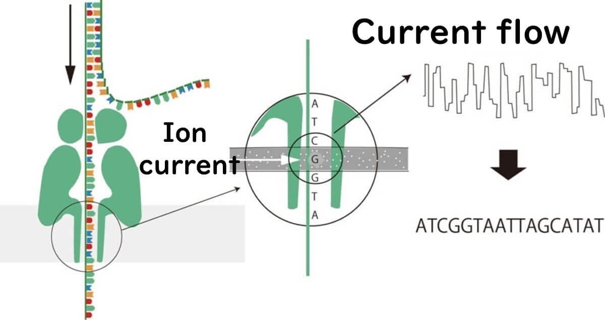 As DNA moves through the nanopore, each nucleotide (A, T, C, G) disrupts the ion current in a unique way. These current changes are detected and translated into DNA sequences.