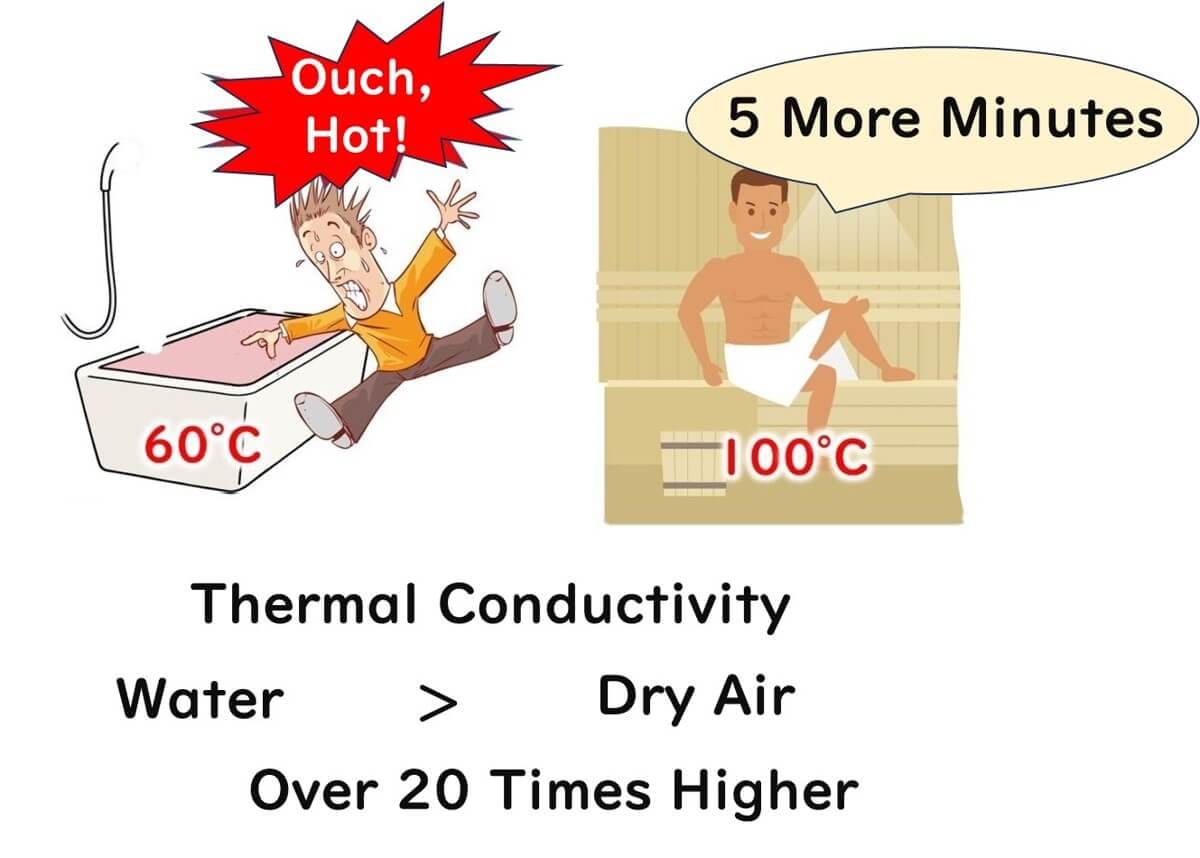 Imagine dipping your finger into a bath of hot water at 60°C. The heat would feel intense, as 60°C is sufficient to denature proteins. Now, consider sitting in a sauna with an air temperature of 100°C. Surprisingly, you wouldn’t feel as much heat despite the higher temperature. Why? The difference lies in the thermal conductivity of water and air.