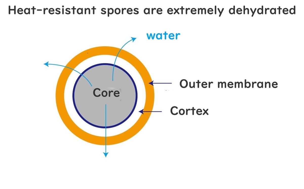 During the process of spore formation, water is systematically removed from the cells, resulting in an extremely dehydrated state. This lack of water plays a critical role in the spores' heat resistance. Water is essential for heat to transfer efficiently and for protein denaturation, a process crucial for microbial sterilisation. In the absence of sufficient water, the heat's ability to damage microbial structures, such as proteins and DNA, is significantly reduced.