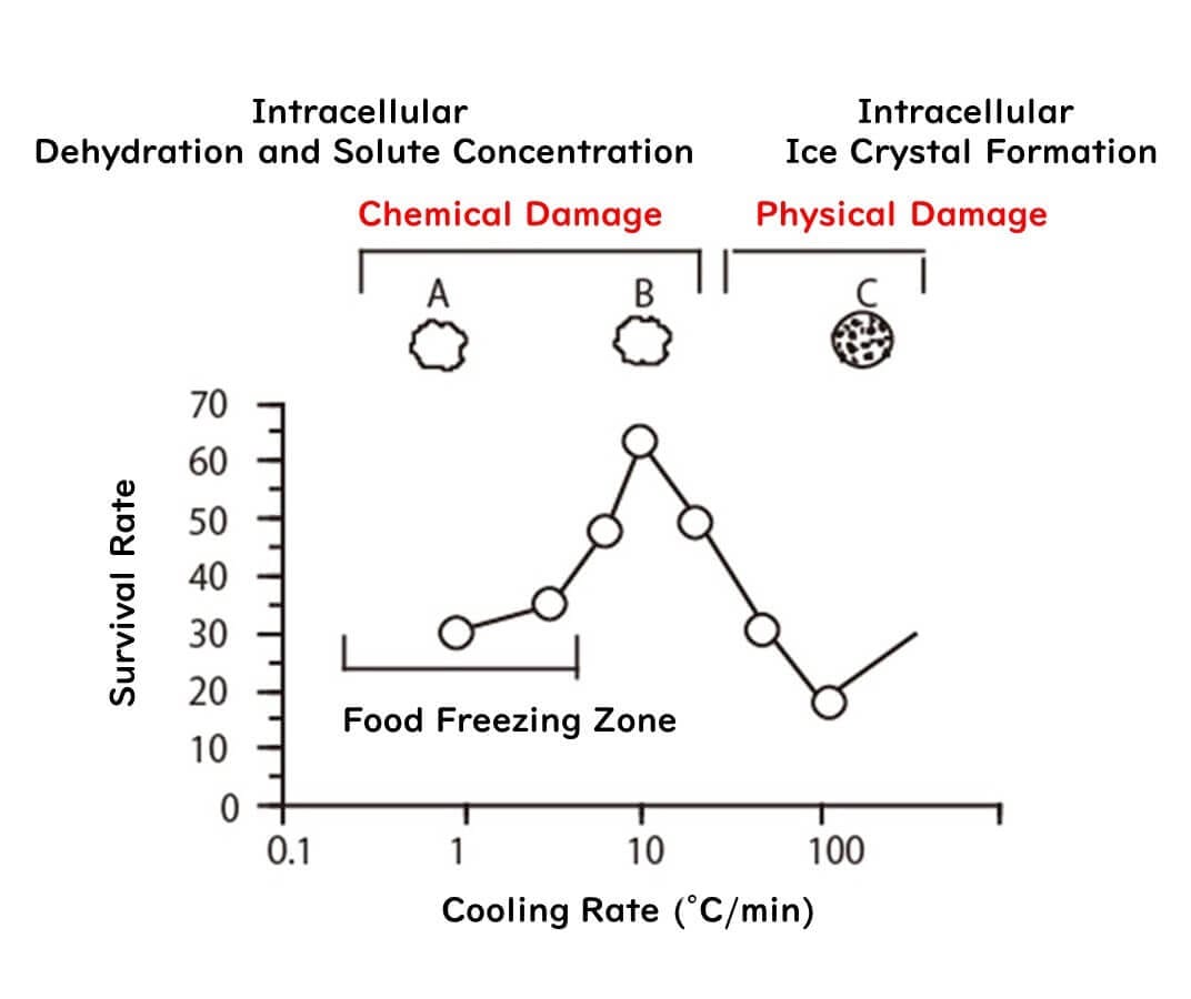The main mechanisms of microbial death and damage during freezing are believed to be dehydration within the cells and damage to the cell surface structures due to the formation of ice crystals. The behavior of microbial cells under freezing conditions is greatly influenced by the cooling rate and the freezing temperature. The diagram below illustrates the relationship between the survival rate of Escherichia coli and the cooling rate when frozen in water. This relationship can be considered a common characteristic of all cells, regardless of whether they are animal or plant cells.