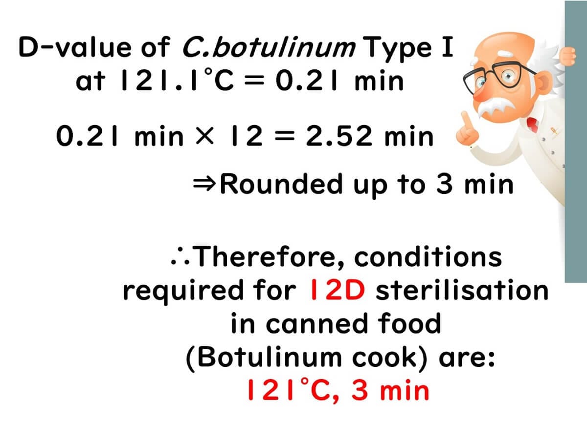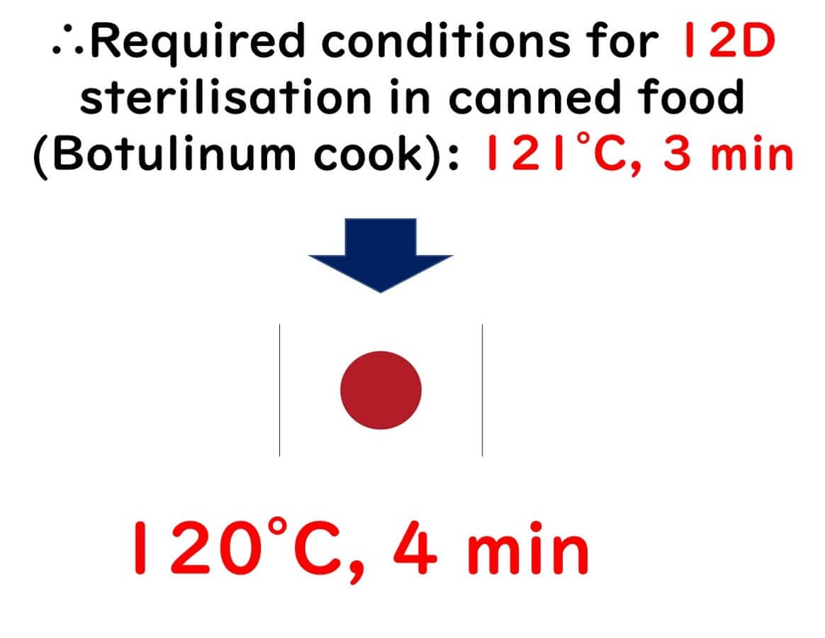 Sterilizing the heat-resistant spores of Botulinum bacteria is not possible with heating at 100°C; it becomes feasible only at 121.1°C. At this temperature, the D-value for Botulinum A spores is 0.21 minutes, a measured value obtained from experimental systems in test tubes. Hence, to achieve sterilization down to 12 decimal reductions, a sterilization time of 0.21 × 12 = 2.52 minutes is necessary.