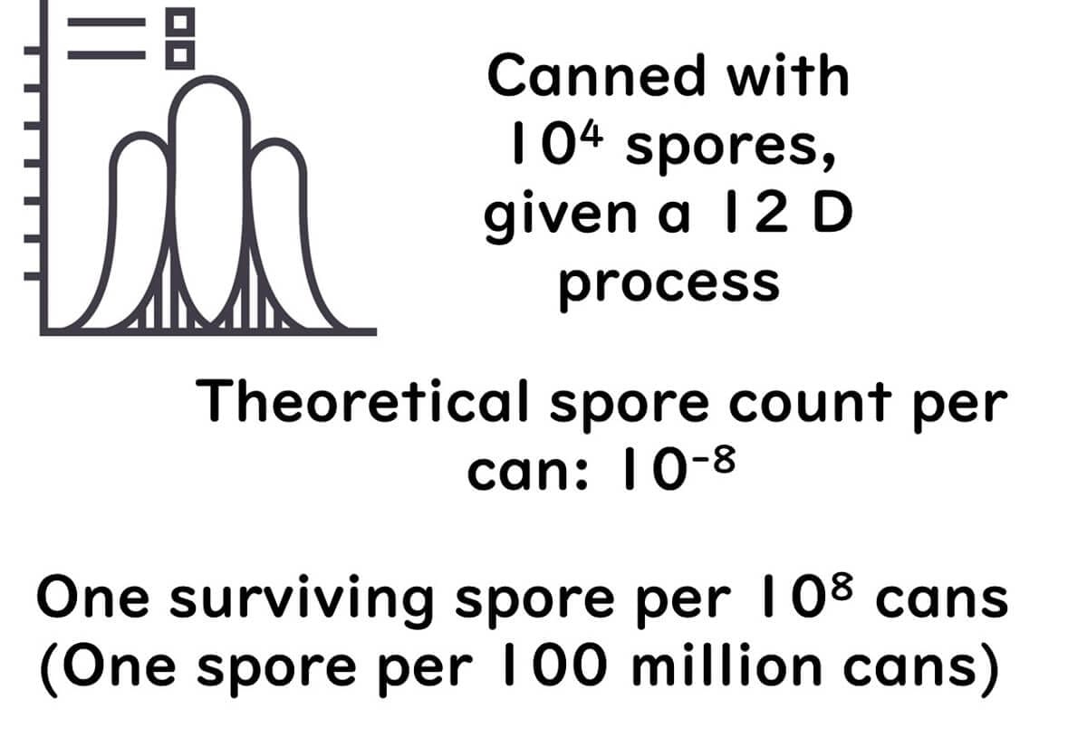 For an even simpler understanding, consider if the packed food was crammed only with botulinum spores. At most, there would only be 10^12 spores per gram. So, even if the entire content of a packaged food was botulinum spores, theoretically, 12D sterilization would wipe them all out—a helpful way to grasp the concept, perhaps!