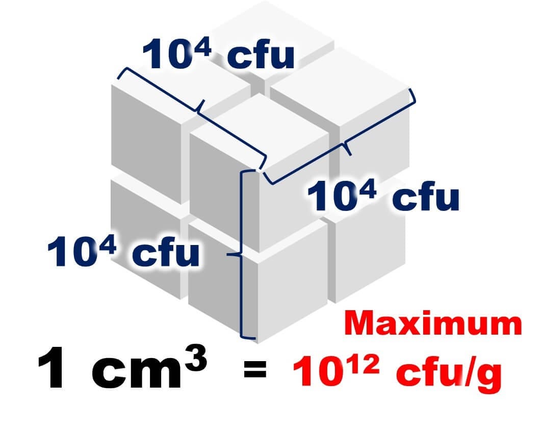 So, why do we start off assuming there are 10^6 spores per gram? To get this, you need a rough idea of the usual bacterial levels in food. As explained in our basic series, "Microbial Counts Around Us (General Aerobic Counts)", fresh fish, meat, or vegetables have about 10^3 microbes per gram. If spoiled, this number rises to 10^7. And our feces? They pack about 10^12 to 10^13 microbes per gram. If you filled a cubic centimeter entirely with microbes, you'd reach these figures—any higher concentration is pretty much impossible.