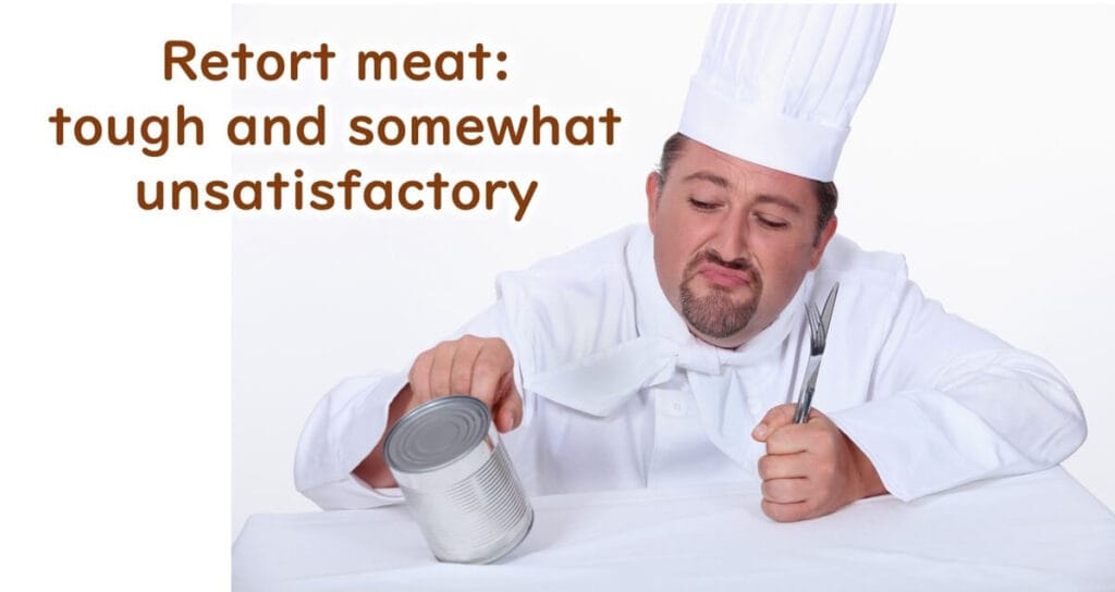 Let's touch a bit on the product development of foods related to heat sterilization. As previously mentioned, retort foods are typically subjected to high temperature and pressure cooking at 121.1°C for 3 minutes. Such high heating temperatures, however, can degrade the food's flavor. For instance, meat processed under these conditions becomes very tough. Consider when you visit a steakhouse; you are asked whether you prefer your steak well-done, medium-rare, or rare. The medium-rare level begins just as the redness in the cut starts to fade, and this occurs around 60°C for about 30 minutes—this slight denaturation of proteins is what makes meat taste best. Thus, the intense heat treatment used in retort products, like 121.1°C for 3 minutes, makes the meat tough and less tasty. From a safety standpoint concerning botulism, sterilization is a must for retort products. However, from a palatability perspective, it's far from ideal.