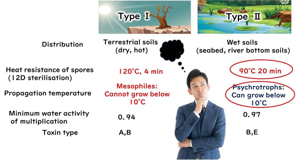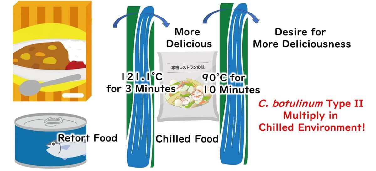 However, Type II botulinum, which can grow at low temperatures, still proliferates even with chilled distribution. But, the heat resistance of Type II spores is less than that of Type I. While Type I requires 121.1°C for 3 minutes to reduce spore count by twelve orders of magnitude, Type II only needs 90°C for 20 minutes.