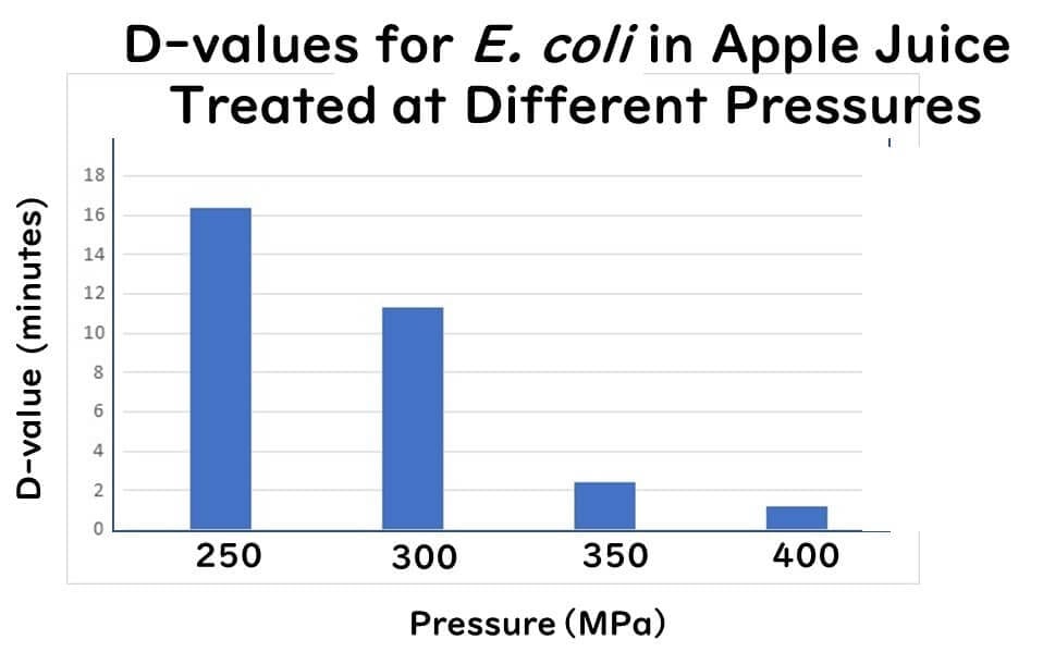 For instance, Lavinas et al. reported that the D-value (the time required to reduce the microbial population by one logarithmic cycle) for Escherichia coli in apple juice (initial population approximately 10610^6106 CFU/mL) was as follows: