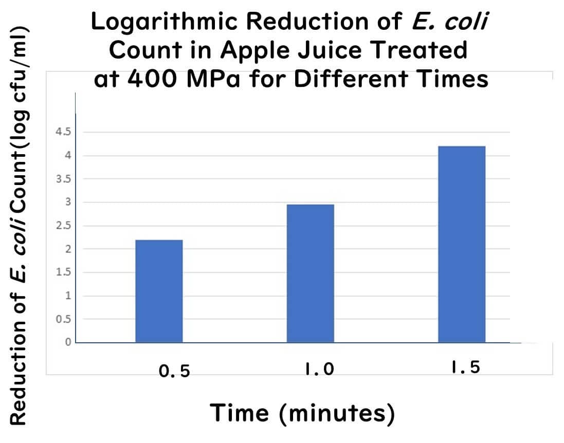 Similarly, increasing the duration of high-pressure processing at a constant pressure also enhances microbial inactivation. According to Lavinas et al.(2008), the logarithmic reduction of E. coli in apple juice processed at 400 MPa was as follows: