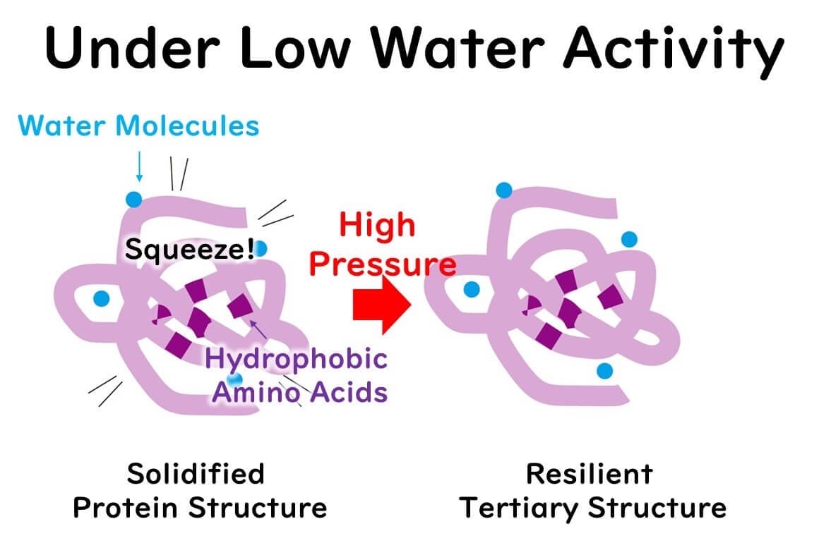 Generally, as water activity decreases, microbial growth is inhibited; however, microbes may also gain resistance to environmental stresses such as heat and pressure. In high-pressure processing, low water activity reduces the sterilizing effect. Although the exact mechanism remains unclear, it is speculated that proteins stabilize under conditions of reduced water activity.