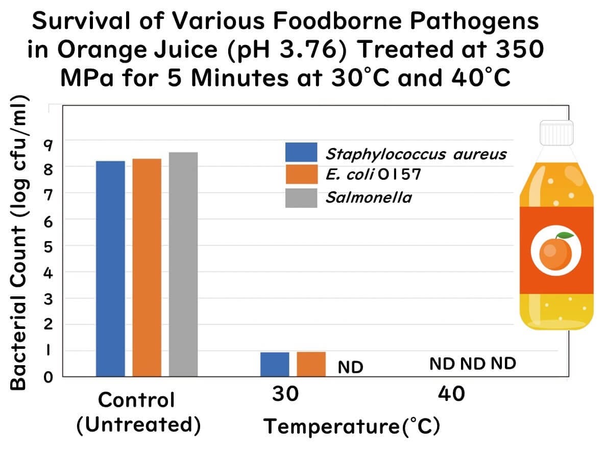 At 250 MPa and 30°C, a 20-minute treatment achieved a 5-log reduction of S. aureus, E. coli O157, and Salmonella.