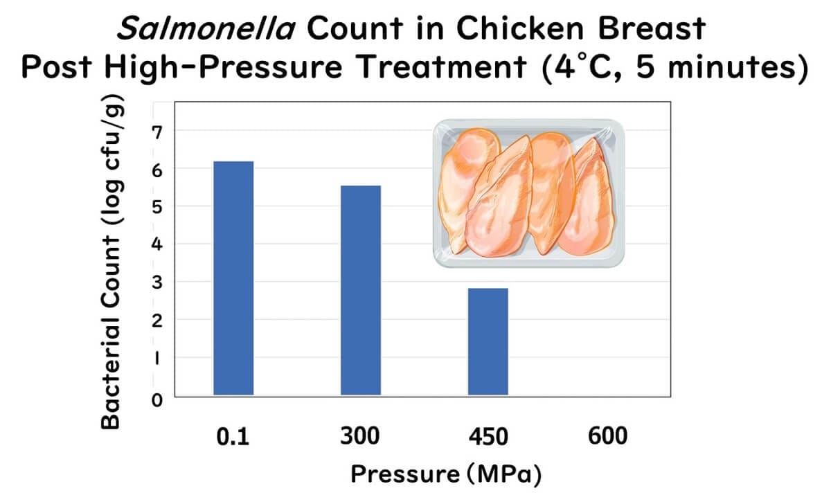 450 MPa and 600 MPa nearly eliminated harmful bacteria (Salmonella, E. coli O157, and Listeria), significantly improving safety.