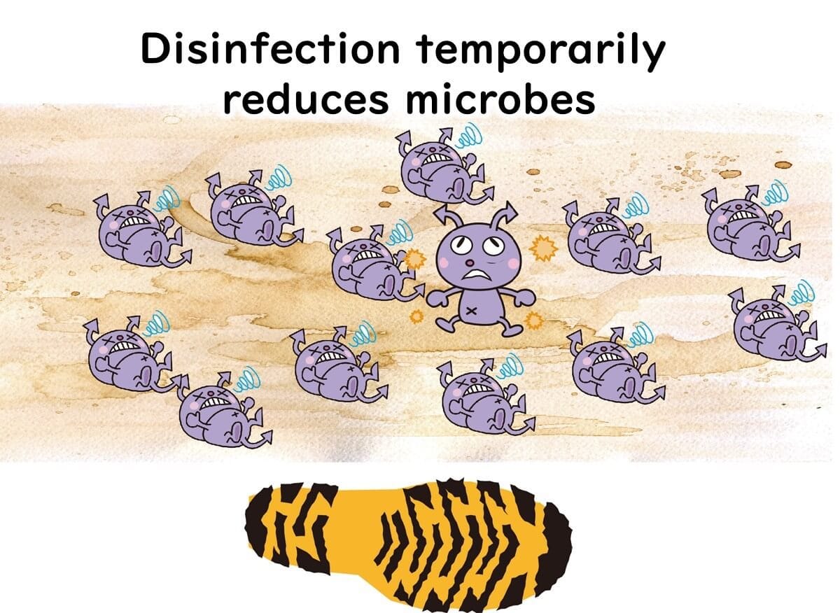 If 99% of microbes are eliminated on boots covered in organic matter, it might seem sufficient—like a catastrophic meteor strike wiping out 99% of Earth's population.