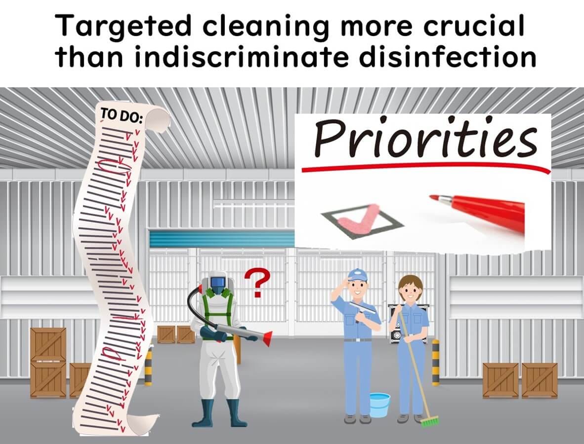Relying solely on disinfection is misplaced. Unless complete sterilization is achieved, common disinfection practices in factories leave behind surviving microbes, emphasizing the need to prevent rapid microbial regrowth by removing organic residues.