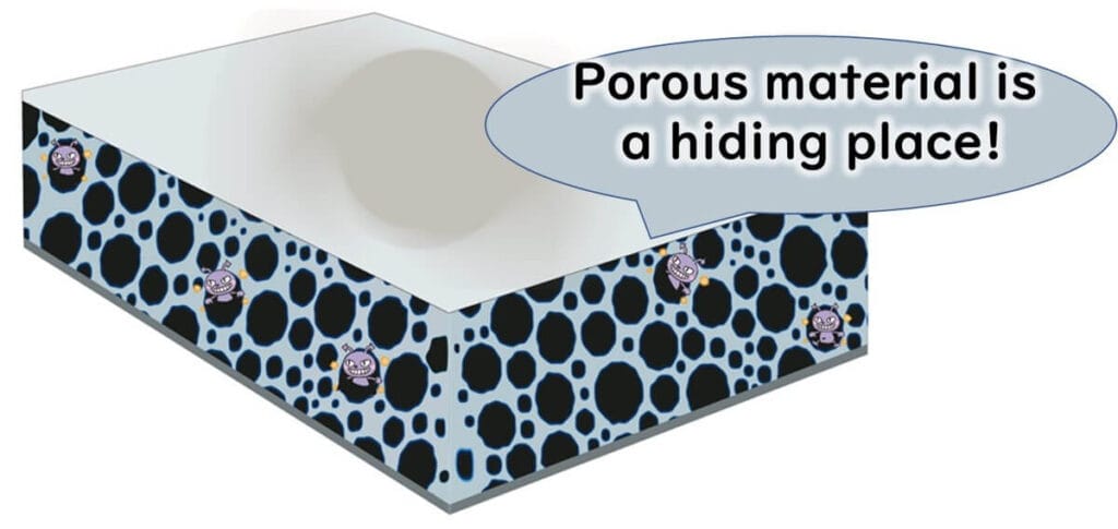 Special attention should be paid to hard-to-clean areas, including surfaces that are fibrous, porous, or rusty, hollow materials with gaps, and inaccessible parts of equipment.