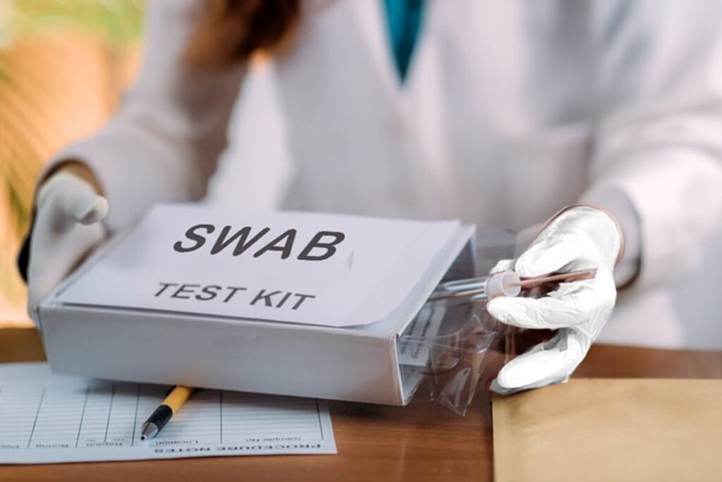 Only moisten the tip without dripping. After sampling, return swab to its tube to maintain sterility.