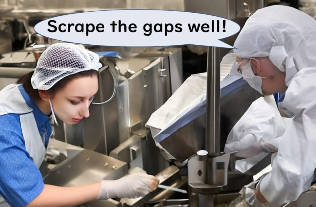 Sampling such hidden spots, where food residues accumulate, may require equipment disassembly with the maintenance team's cooperation.