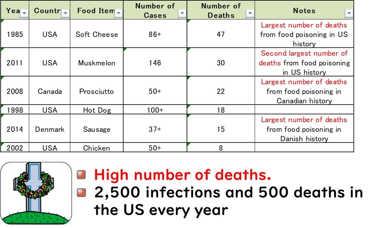 Canada (2008): An outbreak associated with deli meats led to 22 fatalities, the highest number of deaths from a single foodborne illness outbreak in Canadian history.