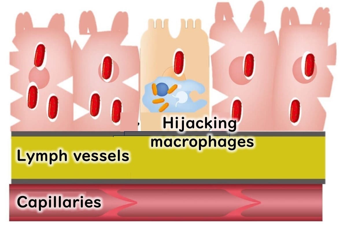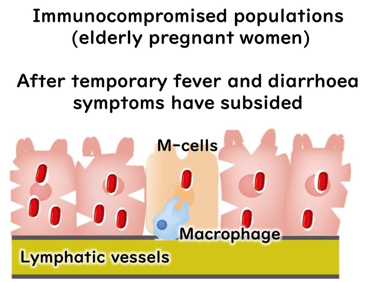 Upon entering the body, L. monocytogenes invades intestinal epithelial cells and is captured by macrophages—immune cells that typically destroy foreign bacteria in lysosomes. In healthy individuals, the bacteria are eliminated at this stage, and symptoms resolve.
