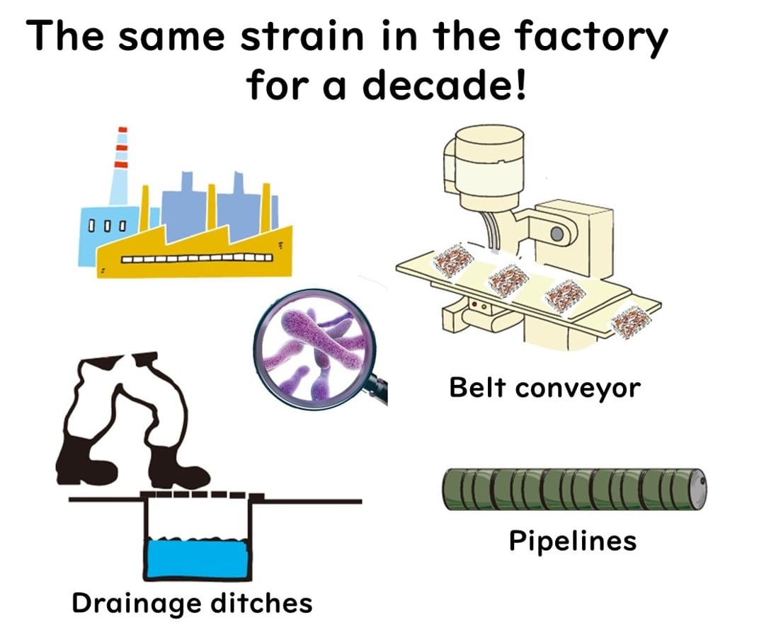 Listeria monocytogenes poses a significant risk in factory environments, particularly in areas like drainage systems. These locations are often cleaned less frequently than production lines or floors due to the challenges of physical scrubbing. As a result, bacteria, including L. monocytogenes, can form biofilms on drain surfaces, creating a robust survival environment.