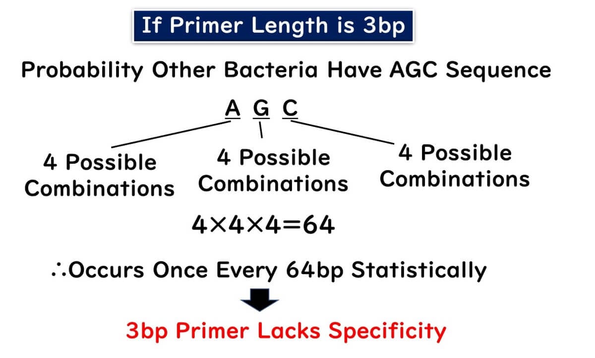 Firstly, consider the scenario where the primer is too short. Imagine a primer with a length of 3 bp, as shown in the figure below. A simple probability calculation reveals that the sequence AGC would appear once every 64 nucleotides: