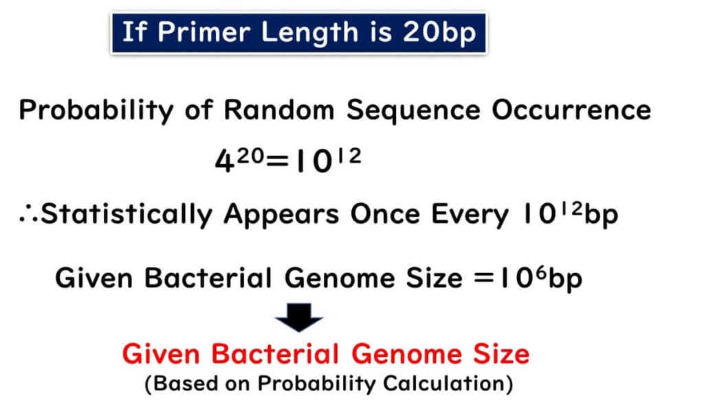 Given that the entire bacterial genome is approximately 106 bp, the probability of this sequence randomly occurring in another bacterium is 1 in 106. Therefore, setting the primer length to 20 bp ensures detection specificity.