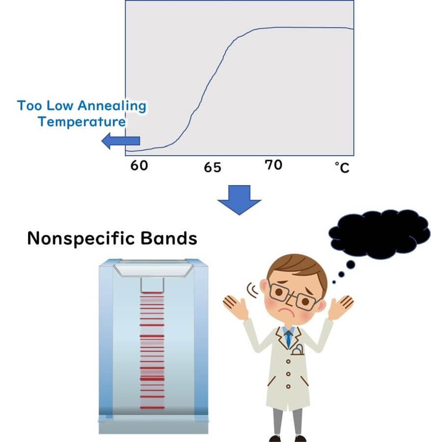 To ensure proper primer binding at the annealing temperature, lower temperatures make it easier for primers to adhere. However, setting the annealing temperature too low can lead to non-specific binding to the template DNA, resulting in numerous non-specific bands. Therefore, the annealing temperature should not be set too low.