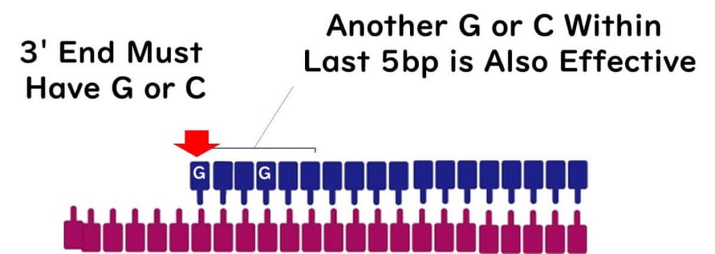Specific placement of G and C bases: Ensure proper distribution, particularly near the 3' end, to optimize stability and specificity.