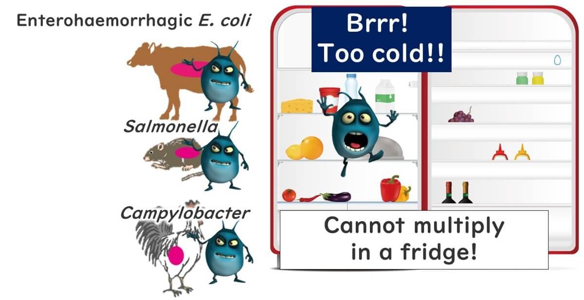 For instance, Listeria monocytogenes is capable of proliferating at both mammalian body temperatures and the cooler conditions of a refrigerator. In contrast, most bacteria causing infectious food poisoning are adapted to thrive near mammalian body temperatures and cannot multiply in refrigerator environments.