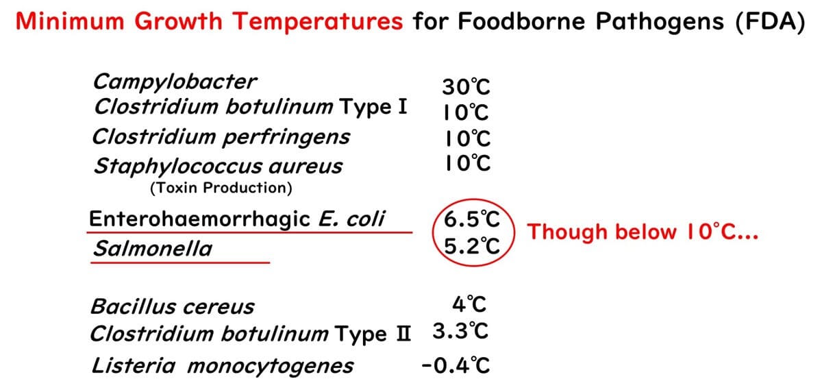 Understanding the relationship between microbial growth and temperature is fundamental in food microbiology. However, misconceptions often arise regarding whether bacteria responsible for infectious food poisoning can proliferate at refrigerator temperatures. This confusion is compounded by information in textbooks and online sources that list the minimum growth temperatures for foodborne pathogens below 10°C.