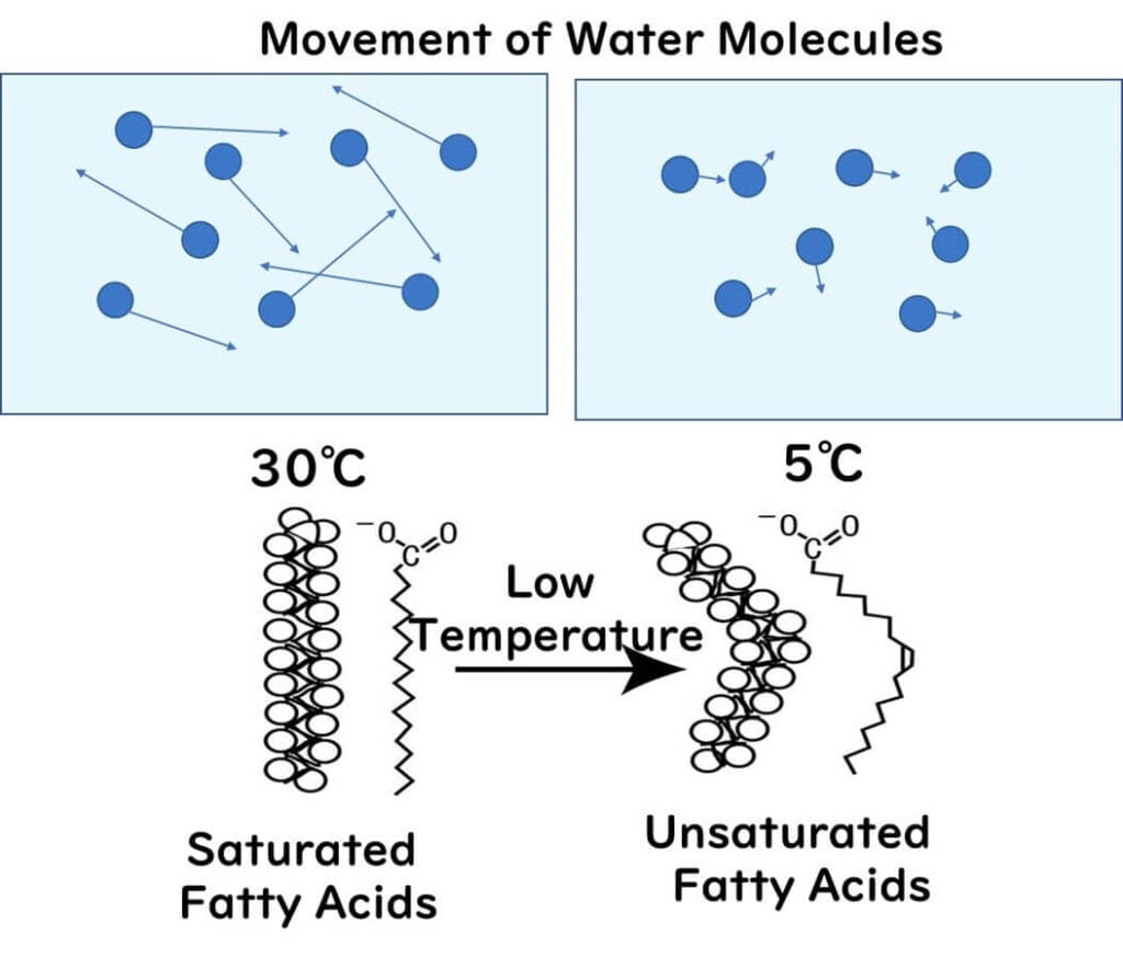 At high temperatures, active water molecules disturb even neatly aligned saturated fatty acids, causing slight instability. Unsaturated fatty acids, already structurally "restless," become even more unstable when exposed to this increased molecular activity.