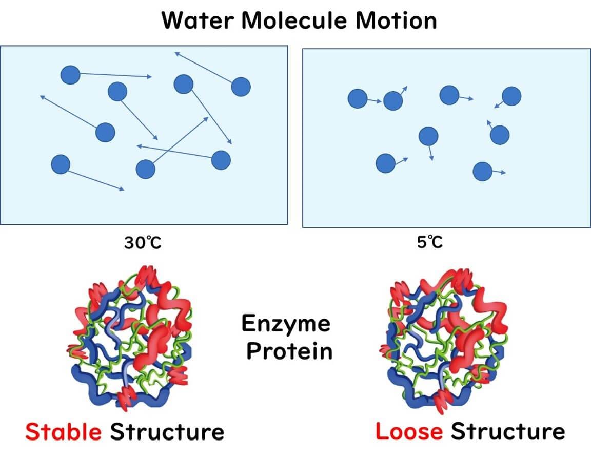 At low temperatures, reduced molecular activity stabilizes protein structures. However, if temperatures drop too low, proteins lose the flexibility required for enzymatic activity.