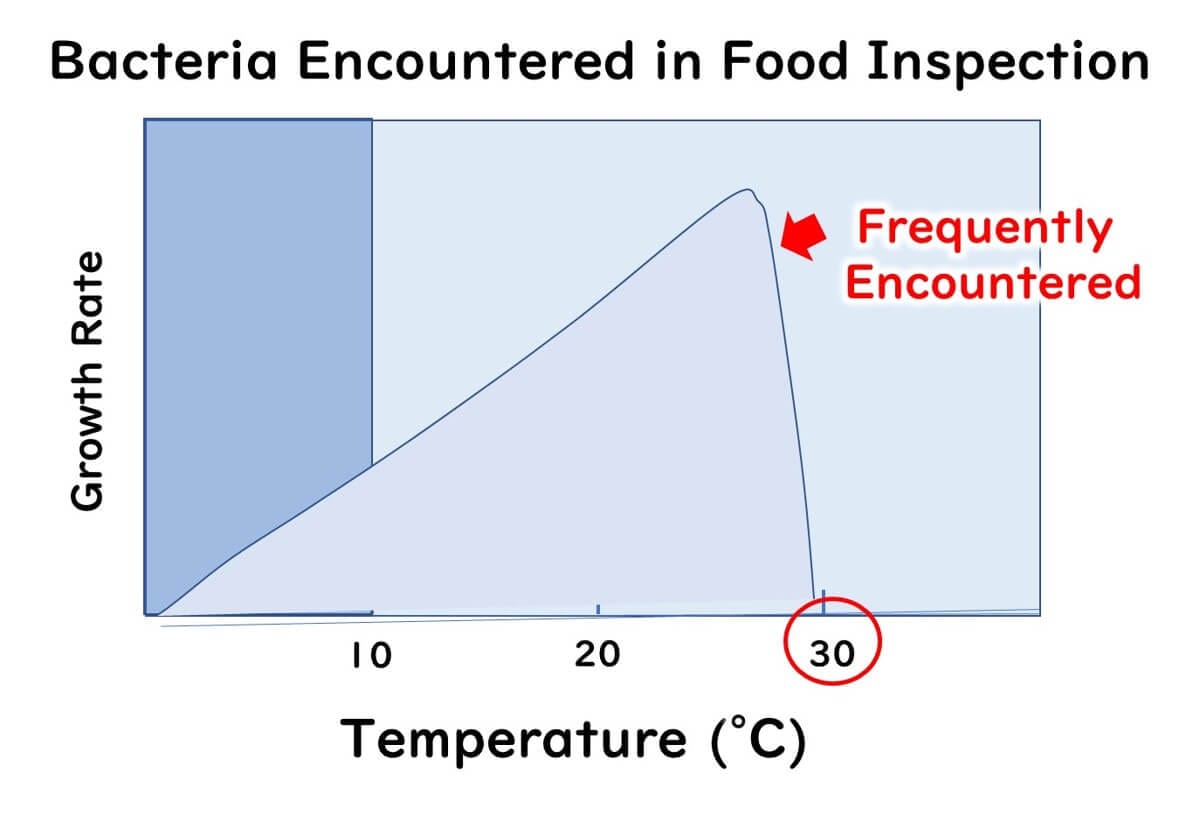 Many bacteria encountered in food handling environments cannot grow at 30°C. For example: