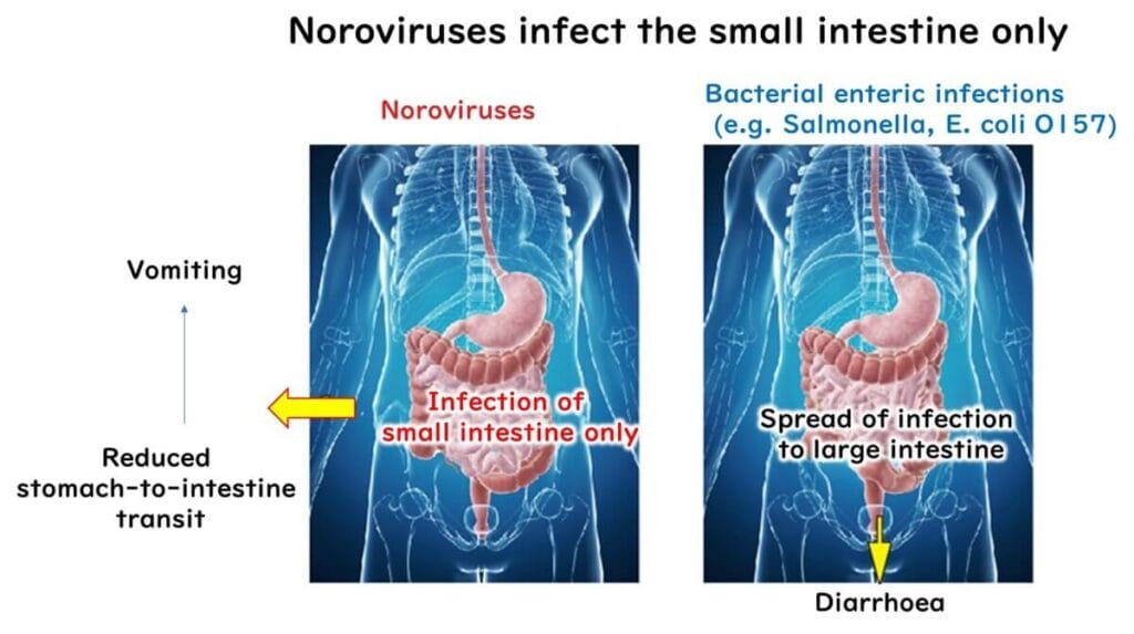 The most distinctive symptom of a norovirus infection is vomiting, as the infection typically targets the upper part of the small intestine. Once noroviruses pass through the stomach and reach the small intestine, the infection begins almost immediately.