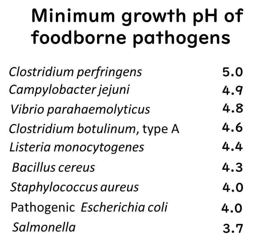 A practical example is Salmonella, which has a minimum growth pH of 3.7. This figure does not indicate active growth at that level but rather the point where some cells may divide. In practical food quality control, maintaining a pH below 5.0 is typically sufficient to prevent significant growth of foodborne pathogens.