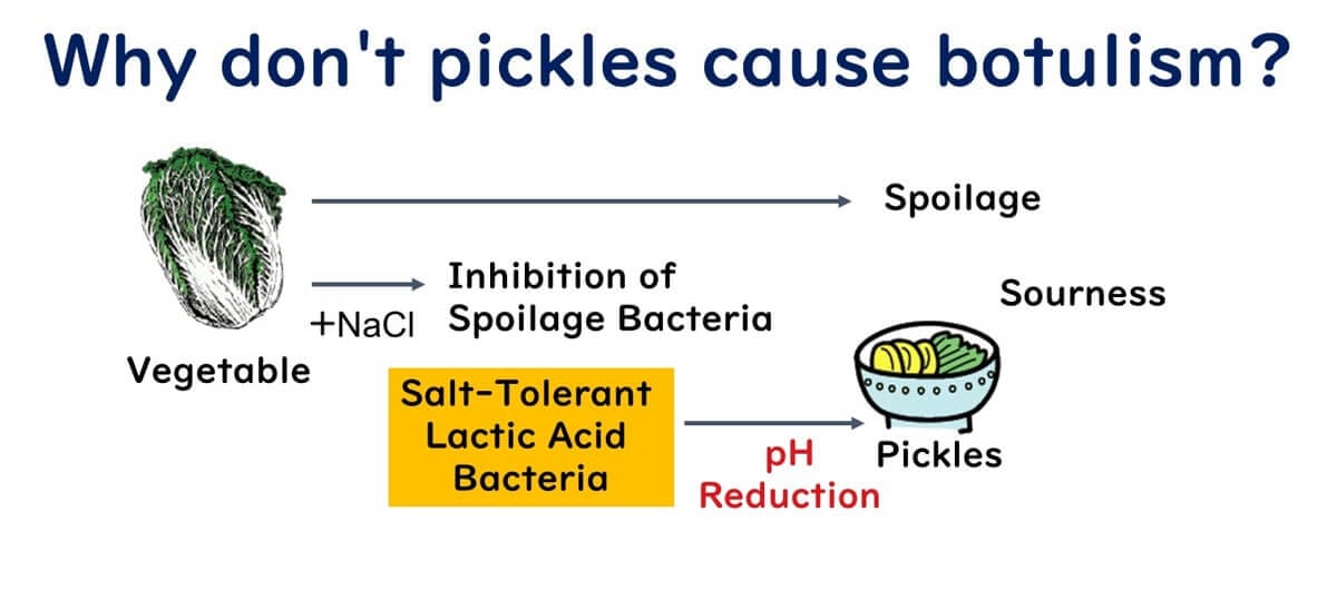 In contrast, salt-tolerant lactic acid bacteria naturally present on the surfaces of vegetables can thrive in such conditions. These bacteria ferment the vegetables, producing lactic acid and reducing the pH of the pickles. This reduction in pH gives pickles their characteristic sour flavor. Importantly, when the pH drops below 4.6, even Clostridium botulinum spores, if present, cannot grow.
