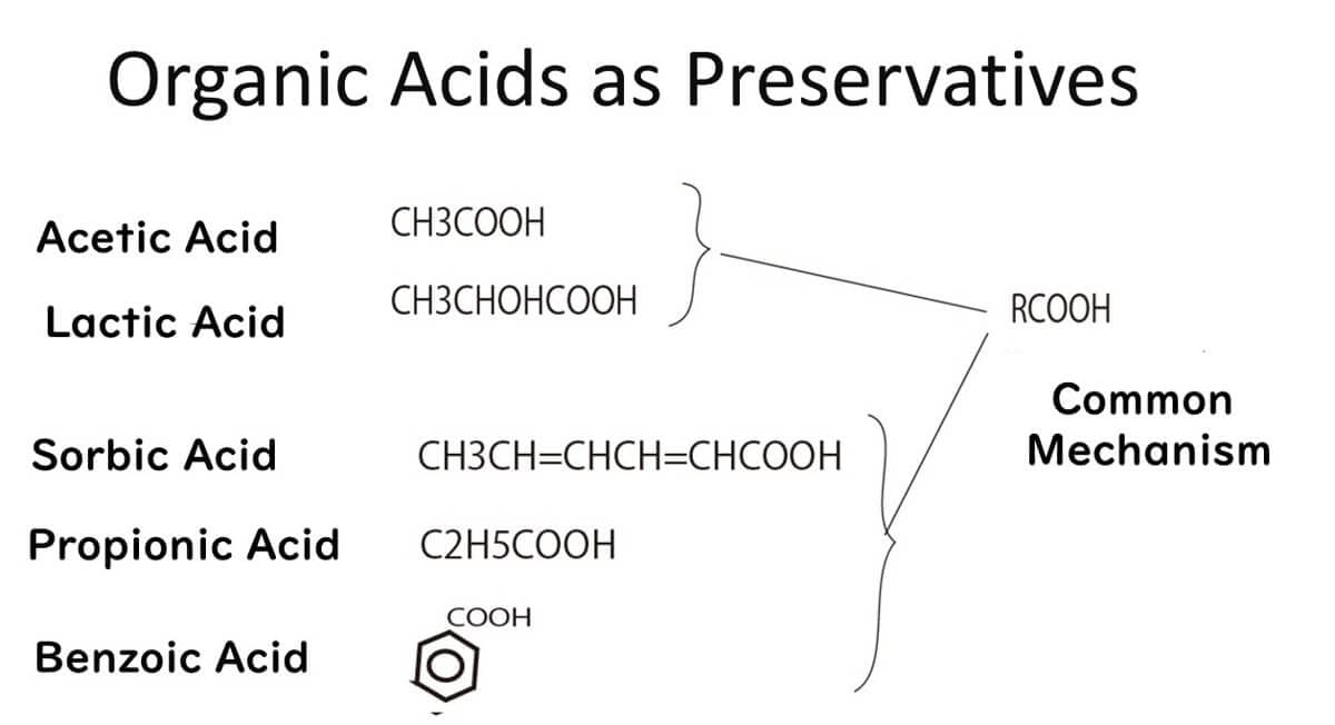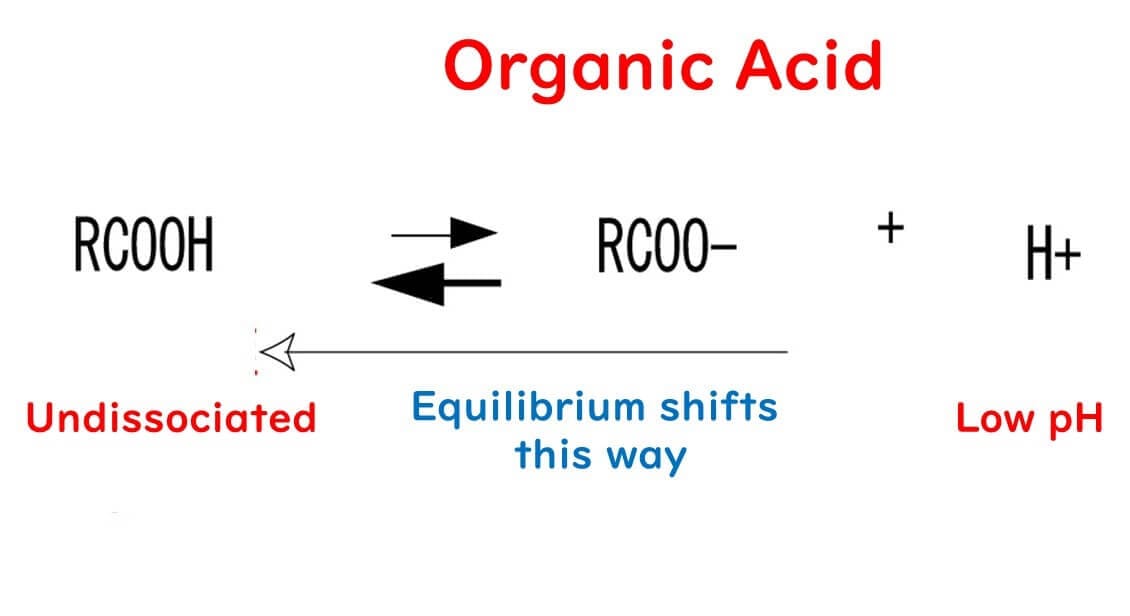 For organic acids to be effective, they must lower the food's pH to sufficiently acidic levels. In acidic environments, organic acids like acetic acid exist primarily in their non-dissociated form (R-COOH), which is more hydrophobic due to the influence of the R group.