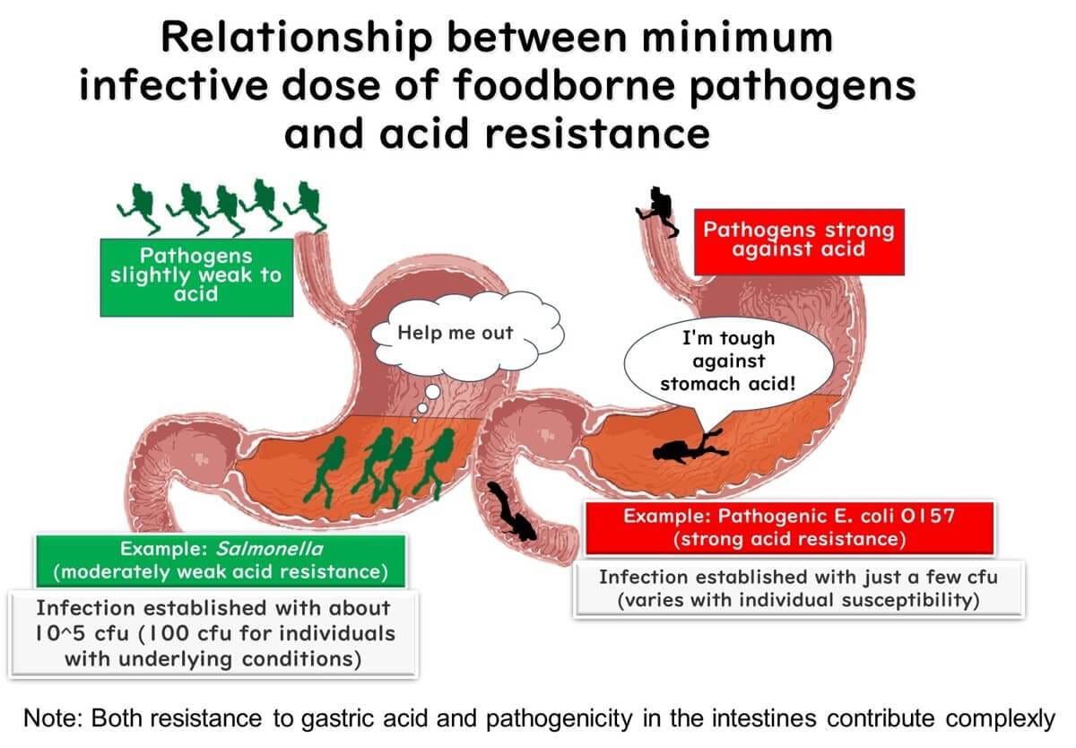 The minimum infectious dose of foodborne pathogens is closely related to their resistance to acidic environments. Comparing two common pathogens, enterohemorrhagic Escherichia coli (EHEC) and Salmonella, illustrates this relationship.