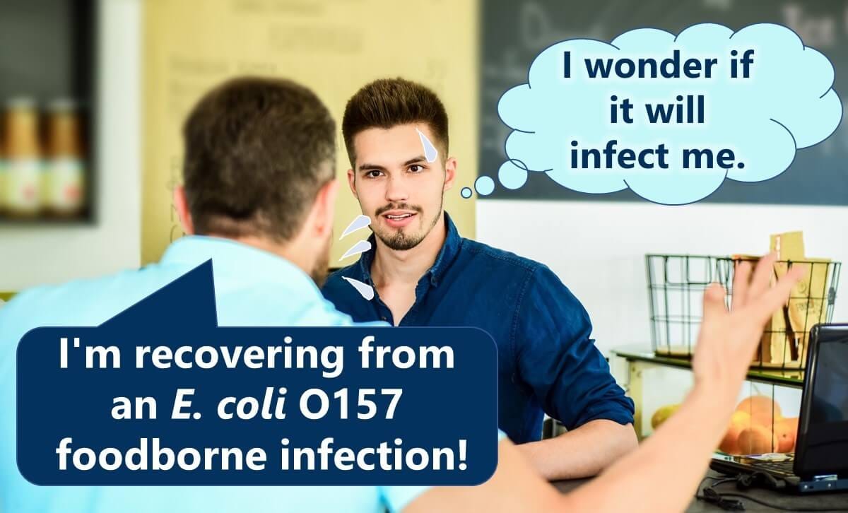Now, imagine you're having a meal with a friend who recently suffered from E. coli O157. Would you be at risk of infection from them through simple conversation at the dining table?