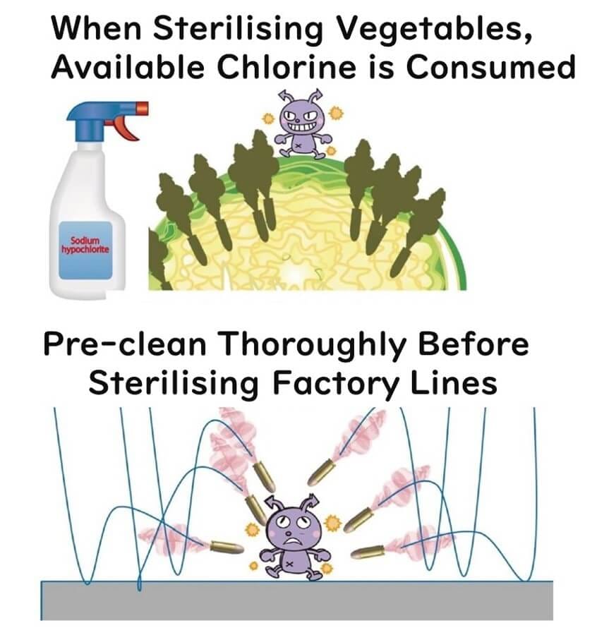 This is particularly crucial when washing vegetables, which are essentially lumps of organic matter, meaning most of the oxidizing power may end up targeting the veggies themselves. However, in a squeaky clean factory setting, sodium hypochlorite's oxidizing power can focus on microbes, maximizing its disinfecting potential.