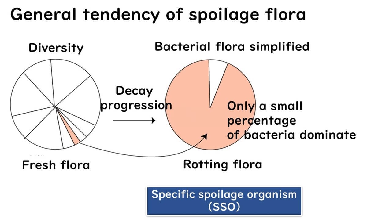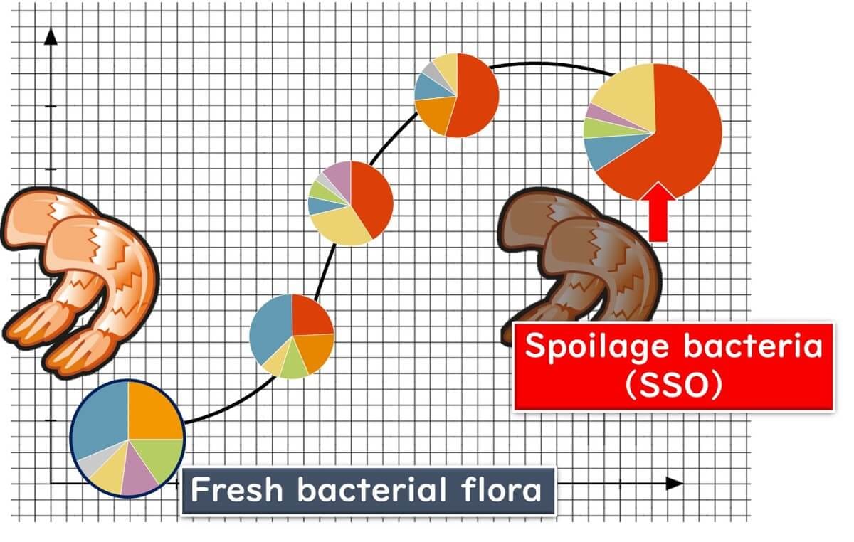 In fresh vegetables and seafood, the bacterial communities are diverse and complex. However, as spoilage progresses, the microbial diversity decreases, and specific spoilage organisms (SSOs) begin to dominate the bacterial flora.